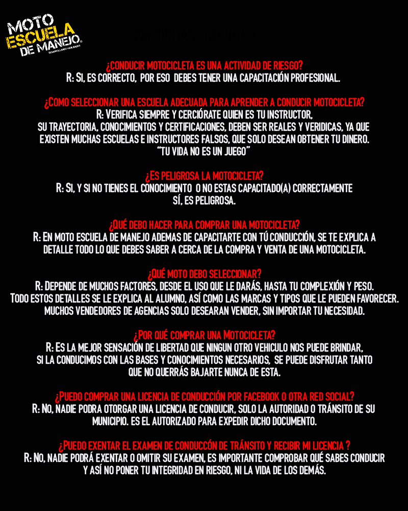 Nuestra Historia Moto Escuela de Manejo. Iniciamos nuestras actividades en el año 2010 con la prestigiada marca Internacional de motocicletas Harley-Davidson Impartiendo Cursos de manera profesional avalados y certificados por Harley-Davidson y MSF (Motorcycle Safety Foundation) Llevando así capacitación especializada a cientos de personas que iniciaban en el ramo del motociclismo con la marca Harley-Davidson. Posteriormente la Agencia Harley-Davidson cambia su ubicación en el año 2011 Av. Santa Barbara 105 Col. Santa María en Monterrey, donde al mismo tiempo. Moto Escuela de Manejo S.A. de C.V. establece sus operaciones en su nueva ubicación en Av. Paseo de los Leones 2956-A Col. Cumbres 5 Sector, donde permanecio por más de 10 años, llevando así cursos de manera profesional al público en general.Actualmente nos encontramos en la zona Sur de Monterrey Impartiendo Cursos con mayor Infraestructura, lo cual nos permite ser la Empresa Lider en el Ramo, ofreciendo a nuestros clientes Cursos Profesionales y de Calidad, otorgando la seguridad y confianza que solo una Escuela Establecida como: Moto Escuela de Manejo S.A de C.V puede ofrecer.Ya que contamos con una larga trayectoria y un gran prestigio que se ha logrado a traves de los años.